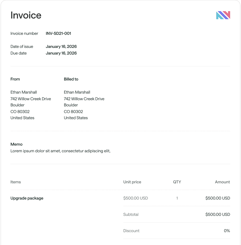 Invoices generated at the end of every billing cycle with line items, taxes, and credits calculated automatically. Deliver via API or PDF — no manual work required.